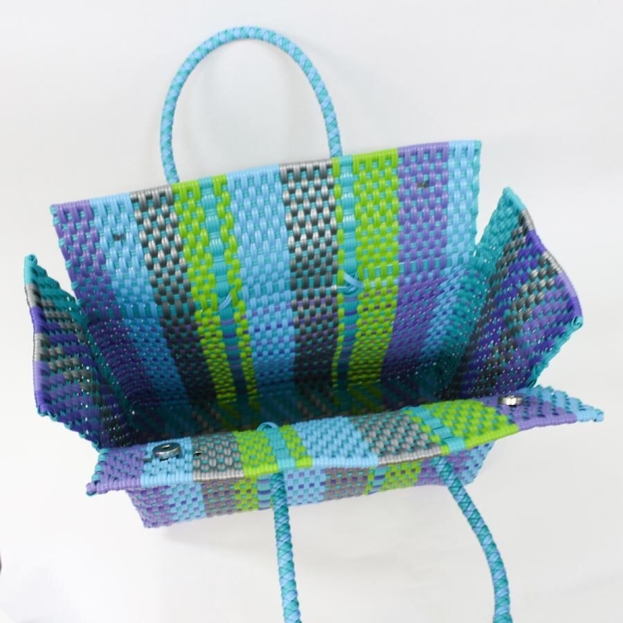 人気のメルカドバッグが登場です。メキシコの職人がひとつひとつ丁寧に手編み。柔軟性のある塩化ビニール製。汚れてもサッと拭き取ればキレイになります。伸びやかな素材は耐久性にも優れているので長く楽しめます。サイズは35cm×23cm×16cmです。1点もののカラーは個性抜群。大いに悩んでお買い上げください!