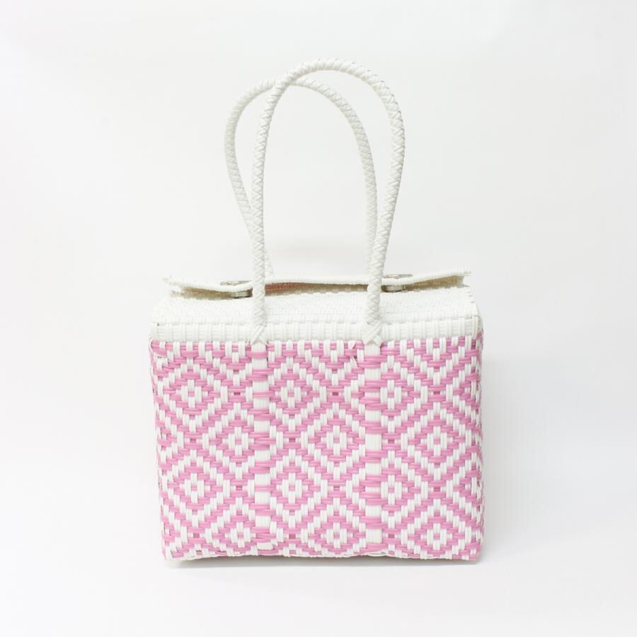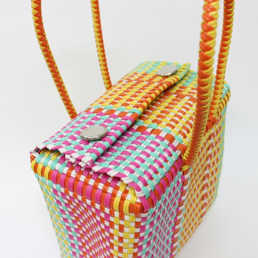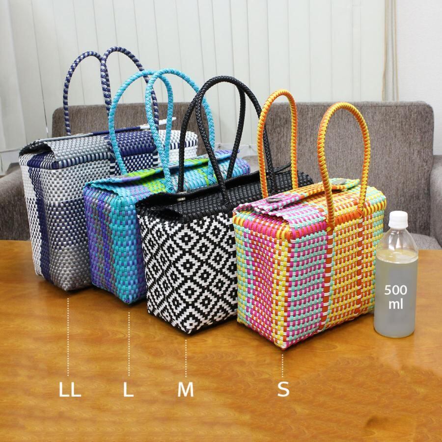 人気のメルカドバッグが登場です。メキシコの職人がひとつひとつ丁寧に手編み。柔軟性のある塩化ビニール製。汚れてもサッと拭き取ればキレイになります。伸びやかな素材は耐久性にも優れているので長く楽しめます。サイズは25cm×20cm×15cmです。1点もののカラーは個性抜群。大いに悩んでお買い上げください!